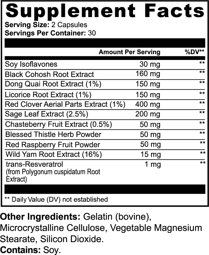 Answer 1: The formula contains ingredients like Dong Quai, Black Cohosh, and Red Clover, which are known for supporting hormonal balance, reproductive health, and well-being. Other ingredients such as Sage Leaf and Chasteberry help with menstrual and menopausal wellness, while Soy Isoflavones and trans-Resveratrol offer plant-based compounds that maintain the body's natural balance.
